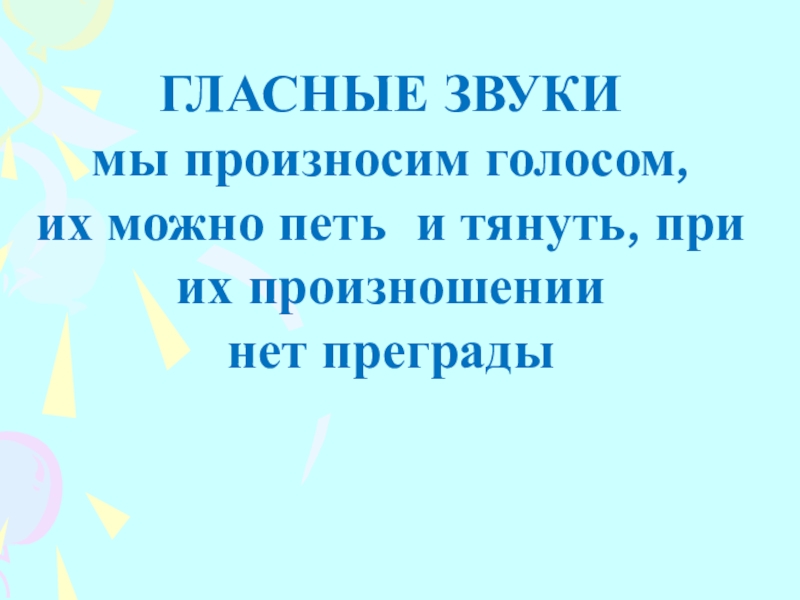 ГЛАСНЫЕ ЗВУКИмы произносим голосом, их можно петь и тянуть, при их произношении нет преграды