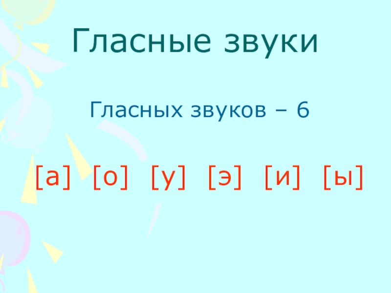 Гласные звукиГласных звуков – 6[а] [о] [у] [э] [и] [ы]