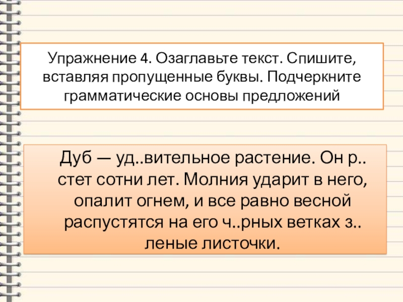 Дуб — уд..вительное растение. Он р..стет сотни лет. Молния ударит в него, опалит огнем, и все равно весной распустятся на его ч..рных ветках з..леные листочки.