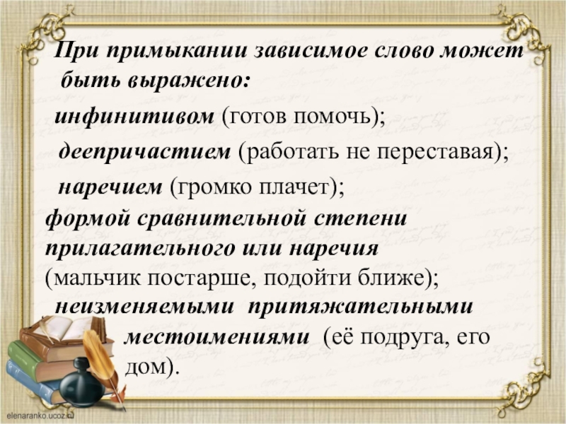 Примыкание — способ связи, при котором зависимое неизменяемо слово (или форма слова) связывается с главным только по смыслу и интонационно, например: идти прихрамывая, очень рад.
