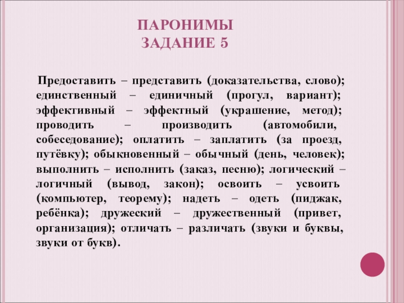 (прогул, вариант); эффективный – эффектный (украшение, метод); проводить – производить (автомобили, собеседование); оплатить – заплатить (за проезд, путёвку); обыкновенный – обычный (день, человек); выполнить – исполнить (заказ, песню); логический – логичный (вывод, закон); освоить – усвоить (компьютер, теорему); надеть – одеть (пиджак, ребёнка); дружеский – дружественный (привет, организация); отличать – различать (звуки и буквы, звуки от букв).