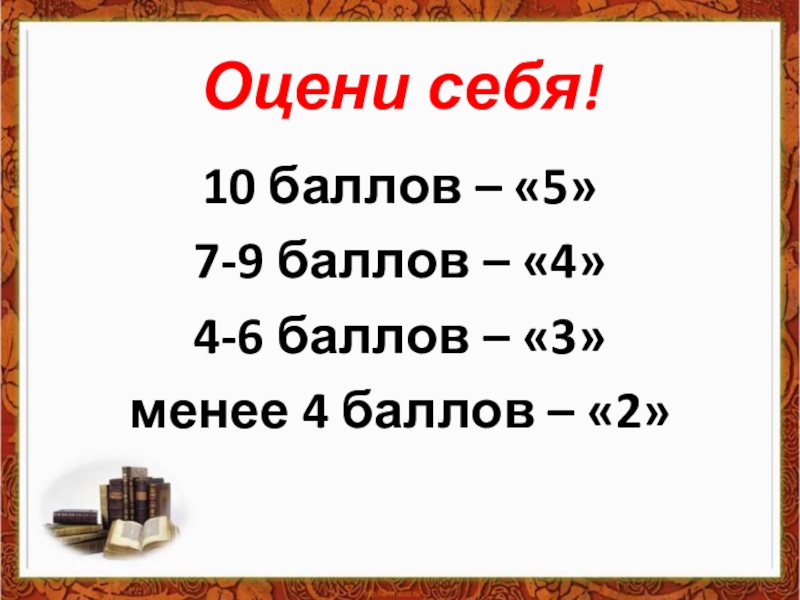 Оцени себя!10 баллов – «5»7-9 баллов – «4»4-6 баллов – «3»менее 4 баллов – «2»