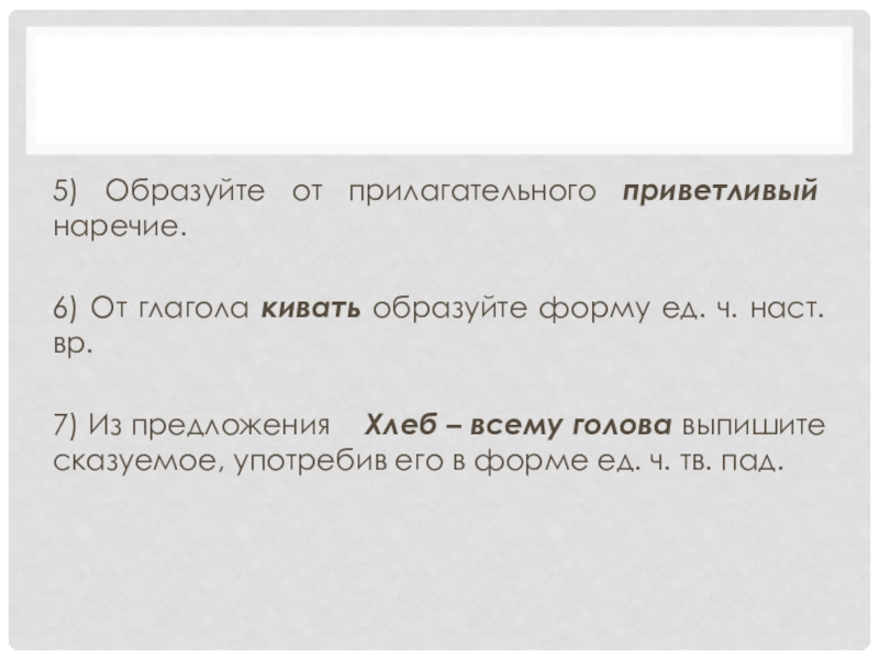 5) Образуйте от прилагательного приветливый  наречие.6) От глагола кивать образуйте форму ед. ч. наст. вр.7) Из