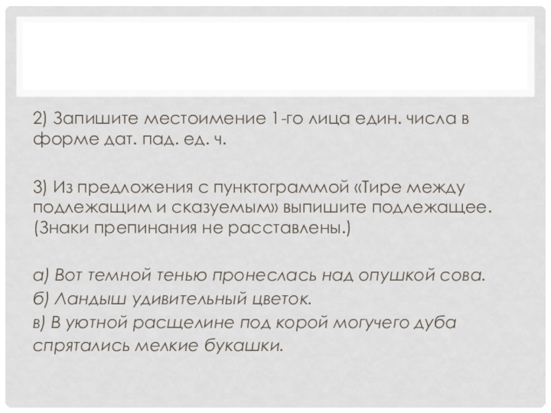 2) Запишите местоимение 1-го лица един. числа в форме дат. пад. ед. ч.3) Из предложения с пунктограммой