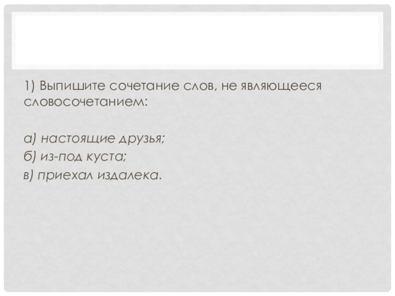 1) Выпишите сочетание слов, не являющееся словосочетанием:а) настоящие друзья;б) из-под куста;в) приехал издалека.