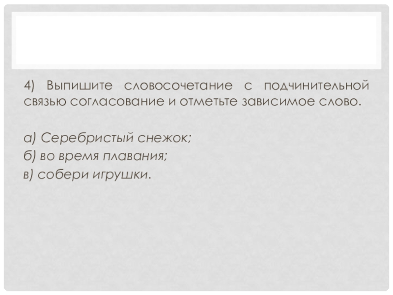 4) Выпишите словосочетание с подчинительной связью согласование и отметьте зависимое слово.а) Серебристый снежок;б) во время плавания;в) собери