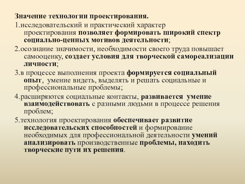 5.технология проектирования обеспечивает развитие исследовательских способностей и формирование необходимых для профессиональной деятельности умений анализировать производственные проблемы, находить творческие пути их решения.