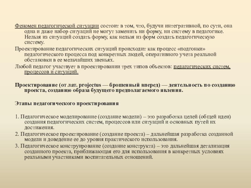 Ситуации всегда конкретны, они создаются или возникают в процессе проведения занятия, экзамена, экскурсии и, как правило, разрешаются тут же. => Проектирование педагогических ситуаций входит в проектирование самого процесса.