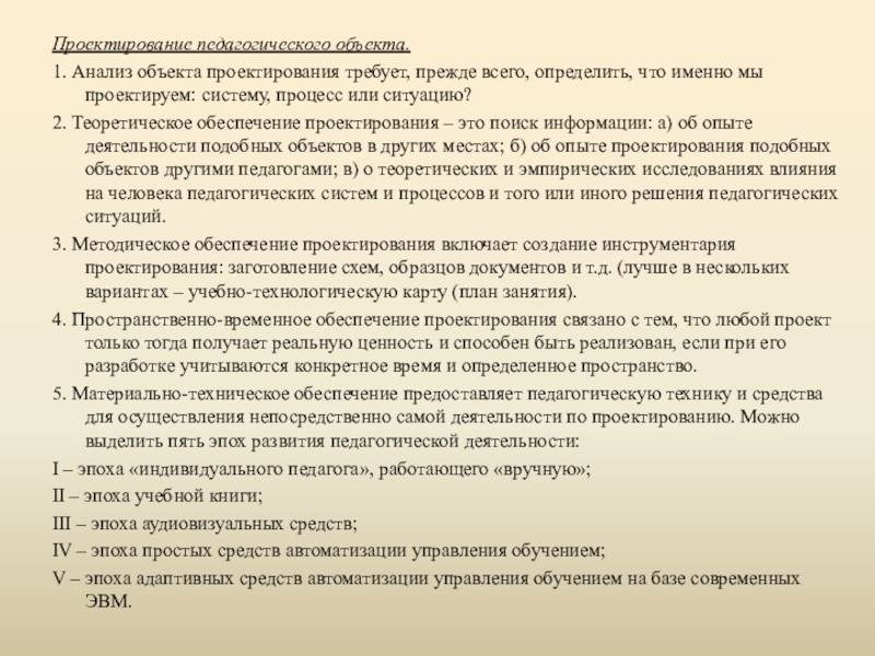 5. Материально-техническое обеспечение предоставляет педагогическую технику и средства для осуществления непосредственно самой деятельности по проектированию. Можно выделить пять эпох развития педагогической деятельности: