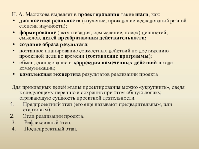 Слайд 10Н. А. Масюкова выделяет в проектировании такие шаги, как: