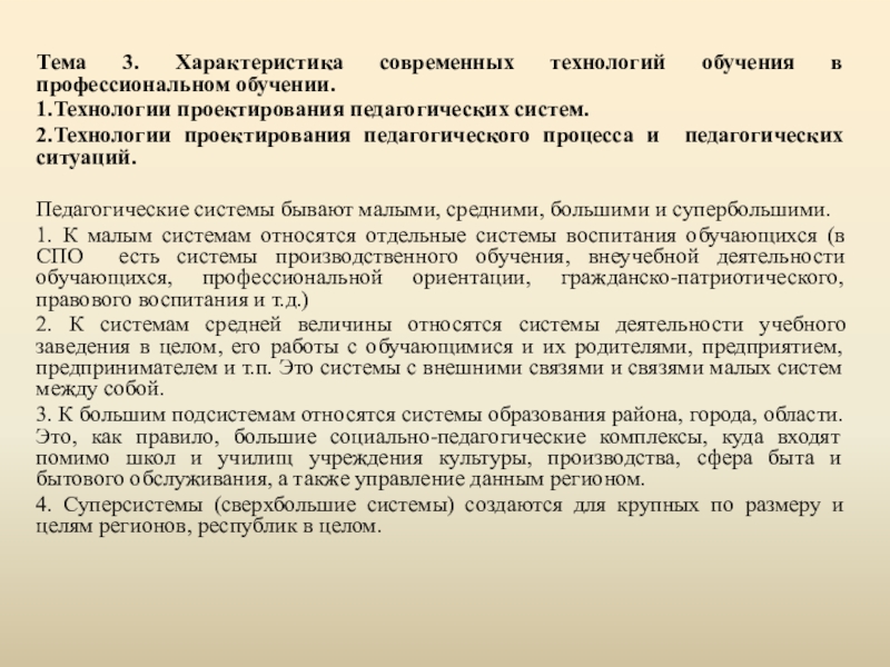 Педагогические системы бывают малыми, средними, большими и супербольшими.