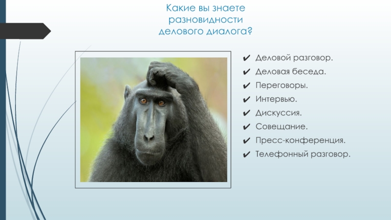 Слайд 4Какие вы знаете разновидности делового диалога?
