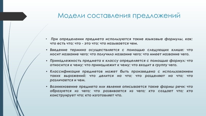 Модели составления предложений При определении предмета используются такие языковые формулы, как: что есть что; что - это что;