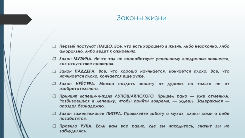 Законы жизниПервый постулат ПАРДО. Все, что есть хорошего в жизни, либо незаконно, либо аморально, либо ведет к