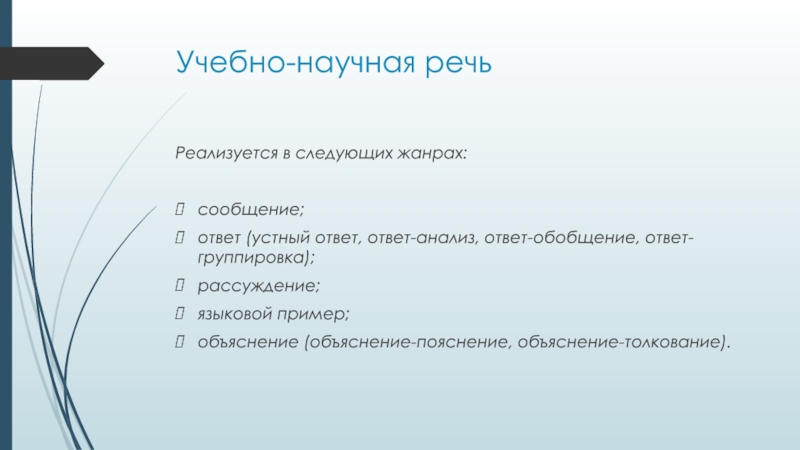 Учебно-научная речьРеализуется в следующих жанрах:сообщение;ответ (устный ответ, ответ-анализ, ответ-обобщение, ответ-группировка);рассуждение;языковой пример;объяснение (объяснение-пояснение, объяснение-толкование).