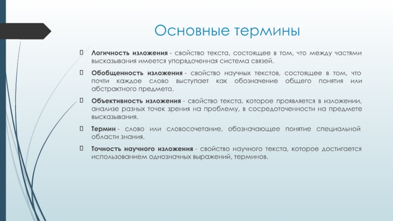 Основные терминыЛогичность изложения - свойство текста, состоящее в том, что между частями высказывания имеется упорядоченная система связей.Обобщенность изложения -