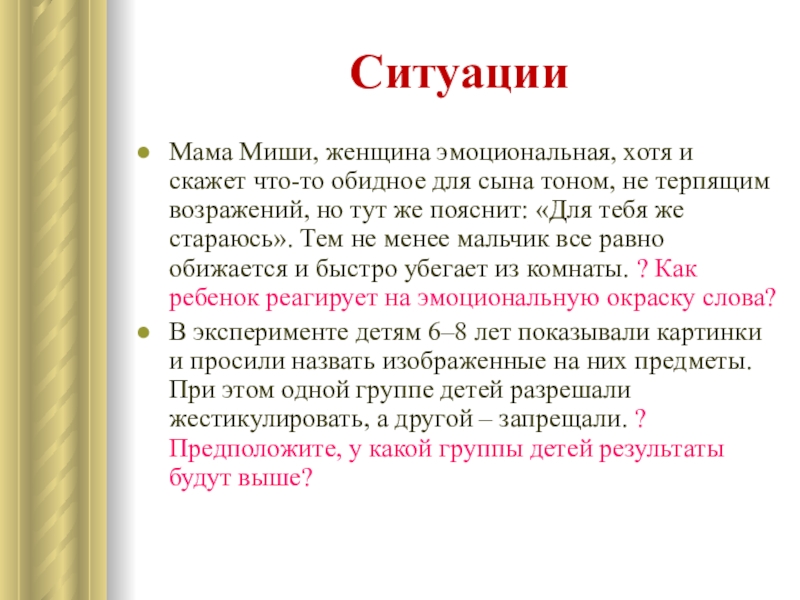 тоном, не терпящим возражений, но тут же пояснит: «Для тебя же стараюсь». Тем не менее мальчик все равно обижается и быстро убегает из комнаты. ? Как ребенок реагирует на эмоциональную окраску слова?