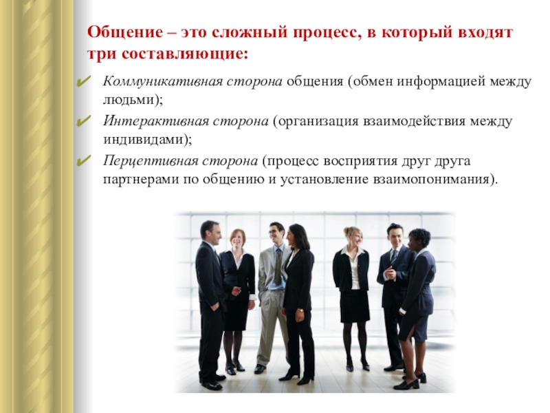 Слайд 4Общение – это сложный процесс, в который входят три составляющие: