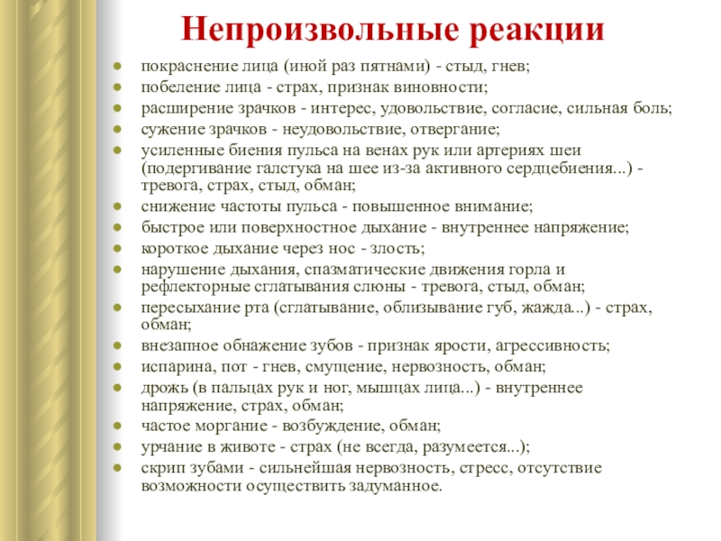 нарушение дыхания, спазматические движения горла и рефлекторные сглатывания слюны - тревога, стыд, обман;