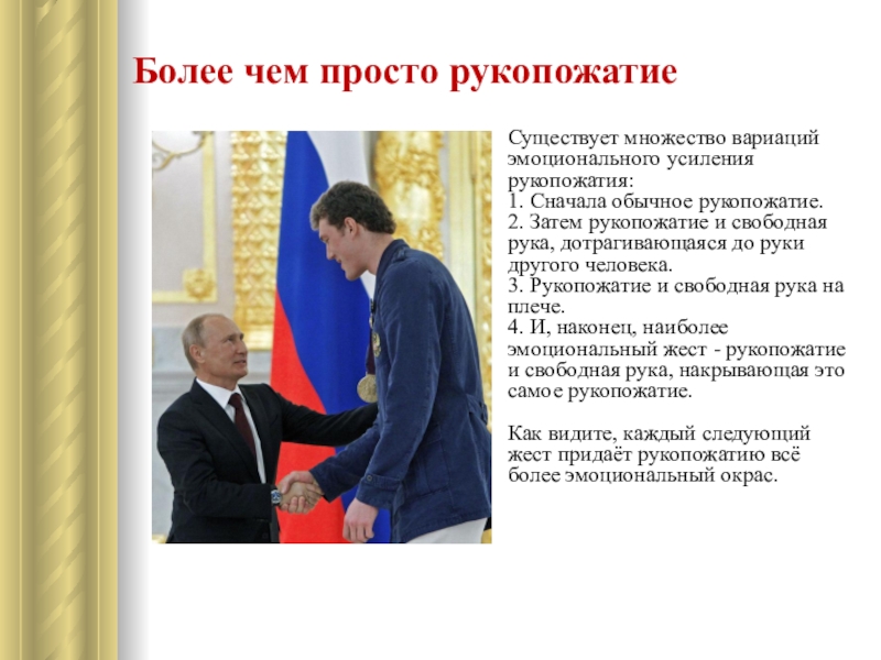 Существует множество вариаций эмоционального усиления рукопожатия: