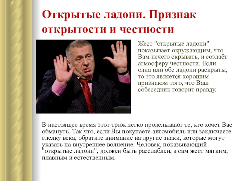 В настоящее время этот трюк легко проделывают те, кто хочет Вас обмануть. Так что, если Вы покупаете автомобиль или заключаете сделку века, обратите внимание на другие знаки, которые могут указать на внутреннее волнение. Человек, показывающий "открытые ладони", должен быть расслаблен, а сам жест мягким, плавным и естественным.