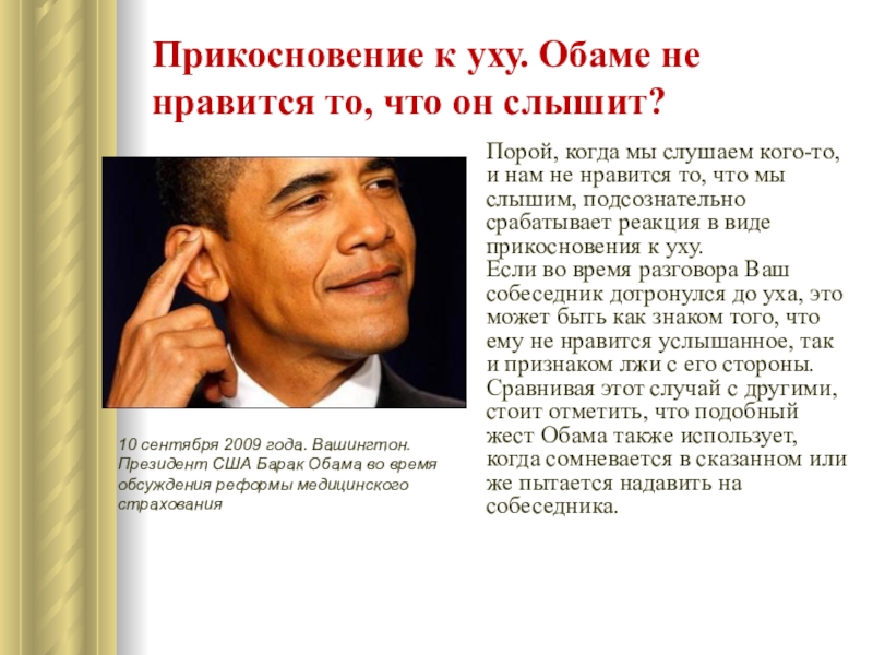 Слайд 26Прикосновение к уху. Обаме не нравится то, что он слышит?