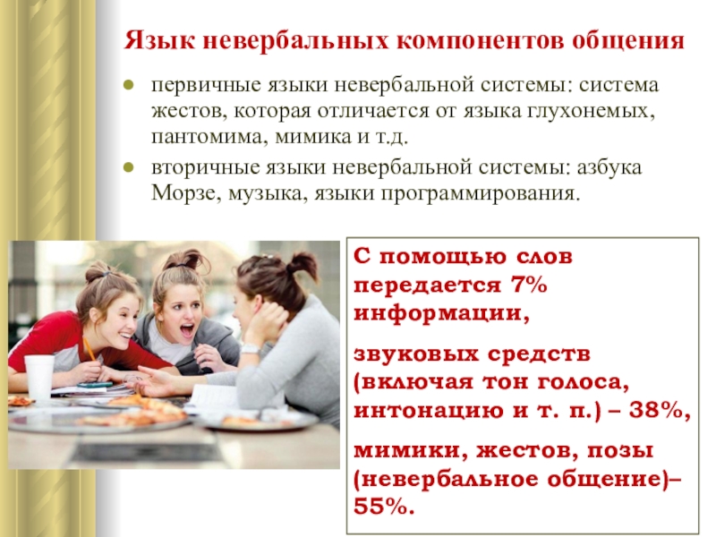 звуковых средств (включая тон голоса, интонацию и т. п.) – 38%,