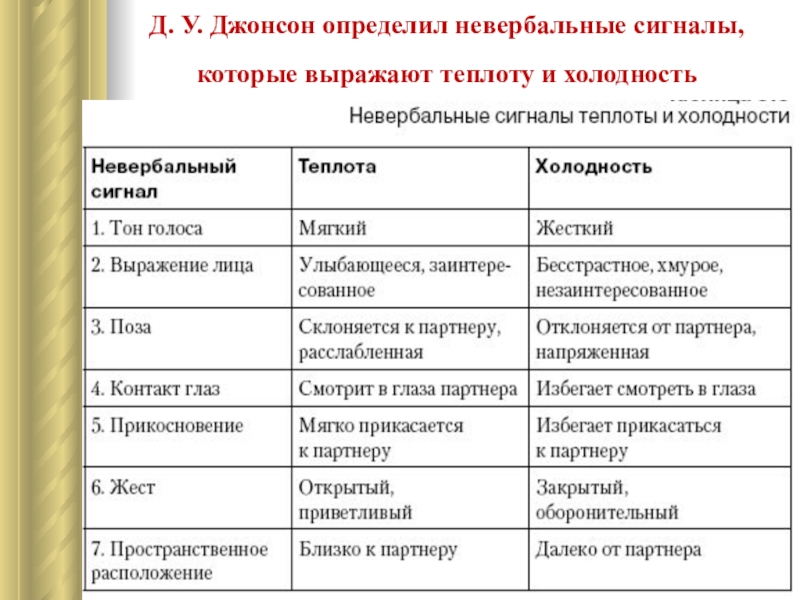 Слайд 34Д. У. Джонсон определил невербальные сигналы,