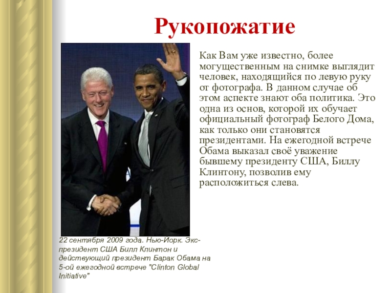 кладёт свою руку другому на спину, как бы направляя его, это является признаком доминирующей силы и власти. Направляясь на голосование, Обама, мастер жестов, использовал данный, чтобы показать своё "президентство" и лидерство.