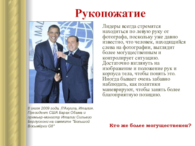 давно известно, что человек, находящийся слева на фотографии, выглядит более могущественным и контролирует ситуацию. Достаточно взглянуть на изображение и положение рук и корпуса тела, чтобы понять это. Иногда бывает очень забавно наблюдать, как политики маневрируют, чтобы занять более благоприятную позицию.