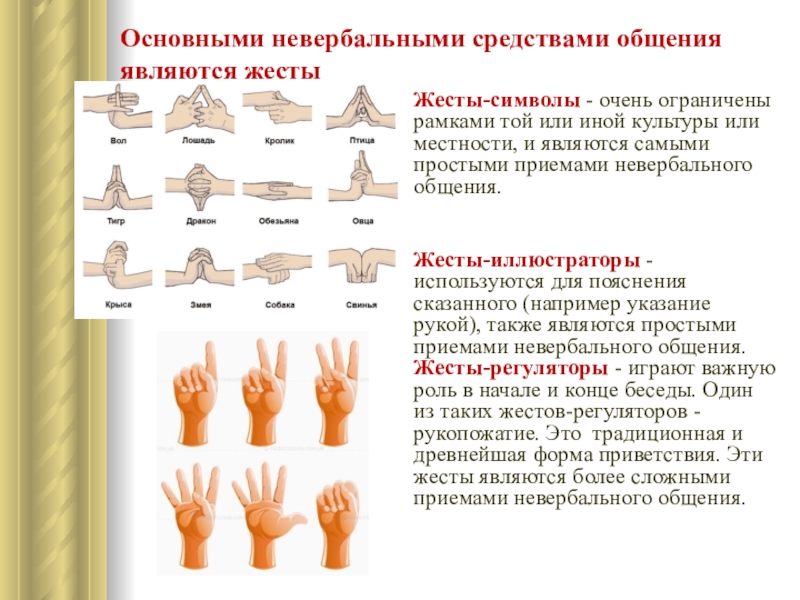 Слайд 13Основными невербальными средствами общения являются жесты: