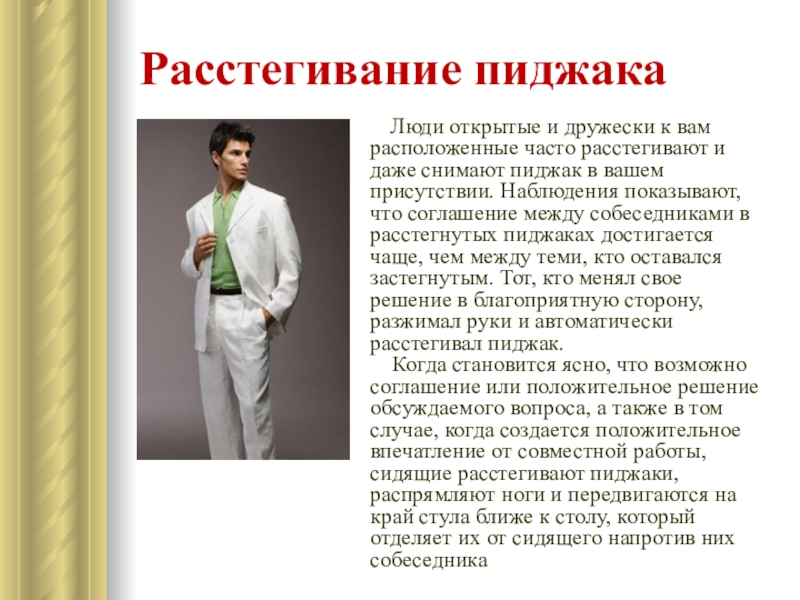 расстегивают и даже снимают пиджак в вашем присутствии. Наблюдения показывают, что соглашение между собеседниками в расстегнутых пиджаках достигается чаще, чем между теми, кто оставался застегнутым. Тот, кто менял свое решение в благоприятную сторону, разжимал руки и автоматически расстегивал пиджак.