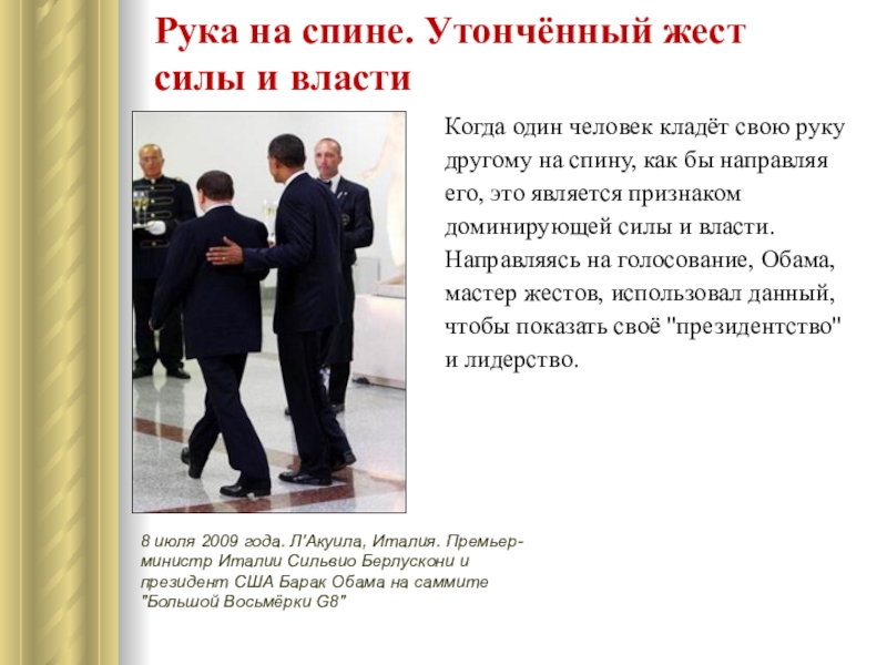 Слайд 21Рука на спине. Утончённый жест силы и власти
