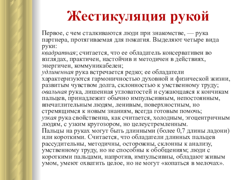 Слайд 16Первое, с чем сталкиваются люди при знакомстве, — рука партнера, протягиваемая