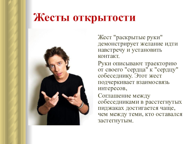 Жест "раскрытые руки" демонстрирует желание идти навстречу и установить контакт.
