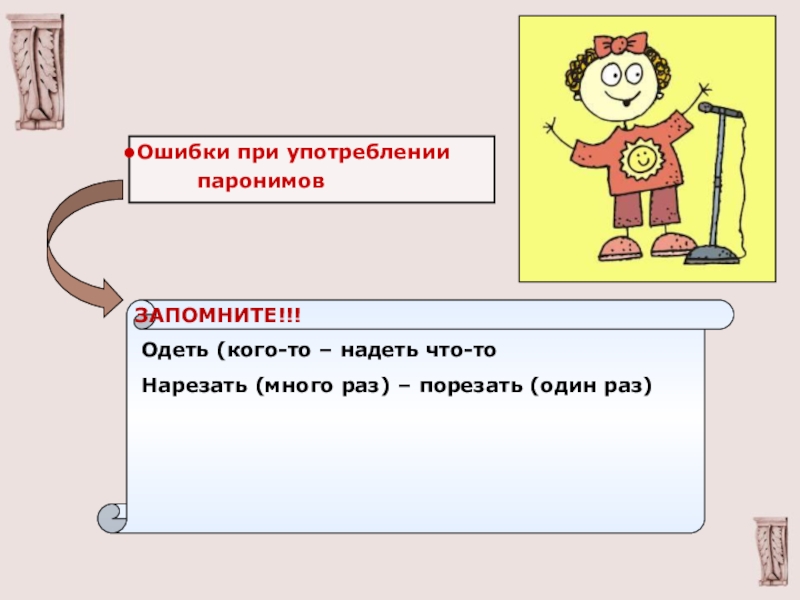Ошибки при употреблении  	  паронимов ЗАПОМНИТЕ!!! Одеть (кого-то – надеть что-то Нарезать (много раз) –
