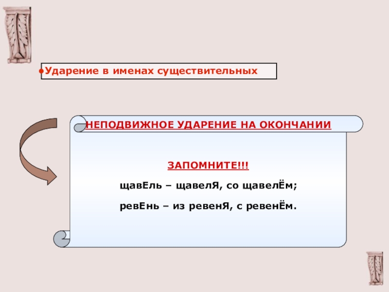 Ударение в именах существительныхНЕПОДВИЖНОЕ УДАРЕНИЕ НА ОКОНЧАНИИЗАПОМНИТЕ!!!щавЕль – щавелЯ, со щавелЁм;ревЕнь – из ревенЯ, с ревенЁм.
