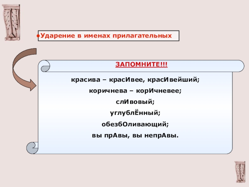Ударение в именах прилагательных	ЗАПОМНИТЕ!!!красива – красИвее, красИвейший;коричнева – корИчневее;слИвовый;углублЁнный;обезбОливающий;вы прАвы, вы непрАвы.