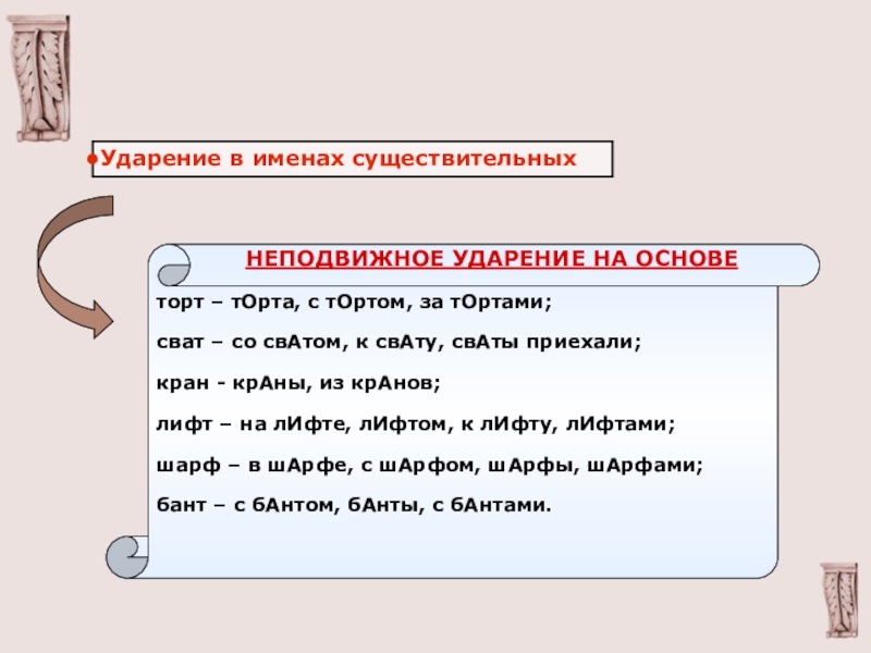 Ударение в именах существительных      НЕПОДВИЖНОЕ УДАРЕНИЕ НА ОСНОВЕторт – тОрта, с тОртом,