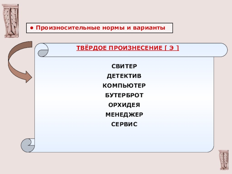 Произносительные нормы и варианты  ТВЁРДОЕ ПРОИЗНЕСЕНИЕ [ Э ]СВИТЕРДЕТЕКТИВКОМПЬЮТЕРБУТЕРБРОТОРХИДЕЯМЕНЕДЖЕРСЕРВИС
