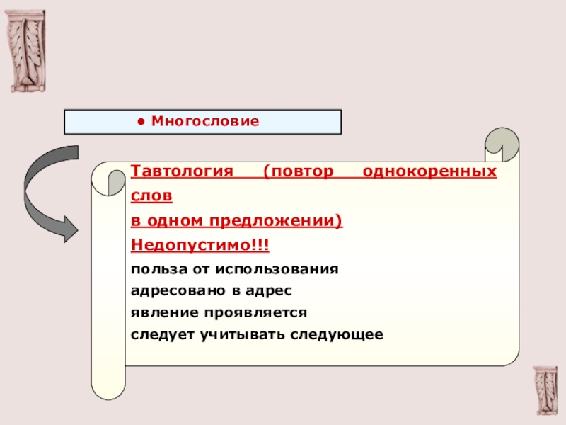 МногословиеТавтология (повтор однокоренных слов в одном предложении)Недопустимо!!!польза от использованияадресовано в адресявление проявляетсяследует учитывать следующее