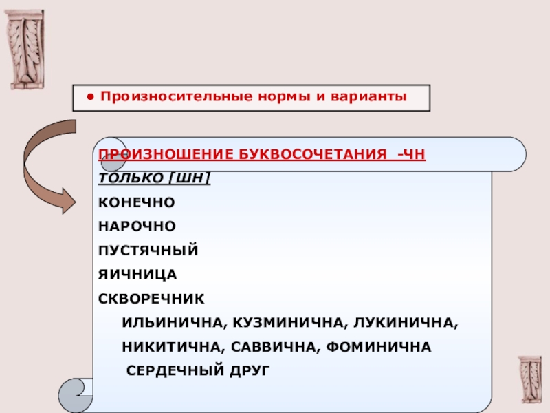 Произносительные нормы и вариантыПРОИЗНОШЕНИЕ БУКВОСОЧЕТАНИЯ -ЧН ТОЛЬКО [ШН]КОНЕЧНОНАРОЧНОПУСТЯЧНЫЙ ЯИЧНИЦАСКВОРЕЧНИК   ИЛЬИНИЧНА, КУЗМИНИЧНА, ЛУКИНИЧНА,