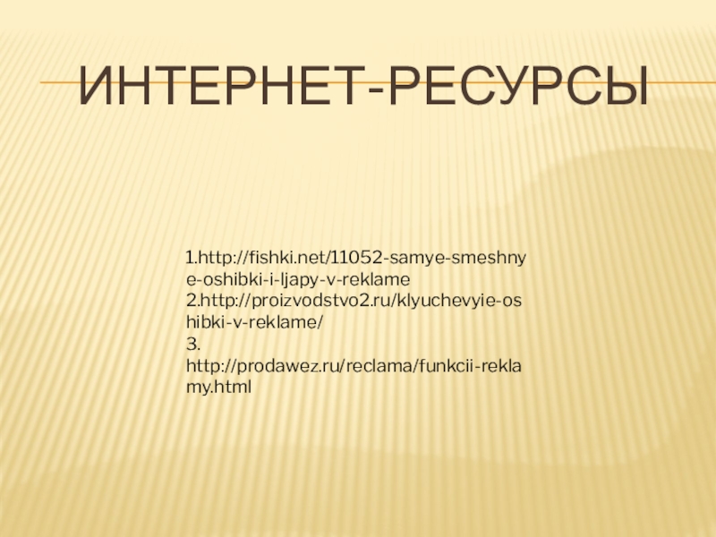 Интернет-ресурсы1.http://fishki.net/11052-samye-smeshnye-oshibki-i-ljapy-v-reklame2.http://proizvodstvo2.ru/klyuchevyie-oshibki-v-reklame/3. http://prodawez.ru/reclama/funkcii-reklamy.html