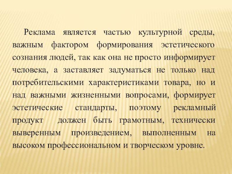 Реклама является частью культурной среды, важным фактором формирования эстетического сознания людей,