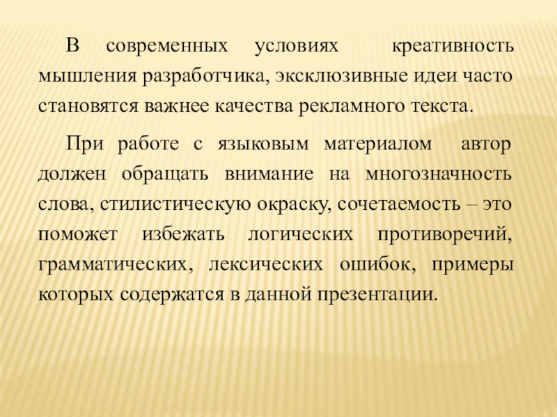 В современных условиях креативность мышления разработчика, эксклюзивные идеи часто становятся важнее качества рекламного текста. 	При работе с