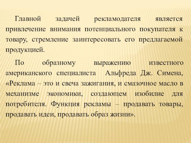 Главной задачей рекламодателя является привлечение внимания потенциального покупателя к товару, стремление заинтересовать его предлагаемой продукцией. По образному выражению известного американского специалиста Альфреда Дж. Симена, «Реклама – это и свеча зажигания, и смазочное масло в механизме экономики,