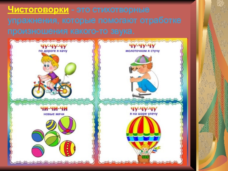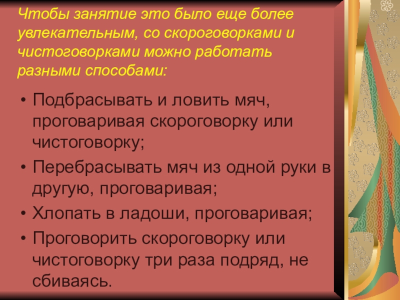 Подбрасывать и ловить мяч, проговаривая скороговорку или чистоговорку;