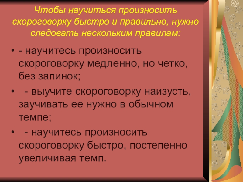Проговорить скороговорку или чистоговорку три раза подряд, не сбиваясь.