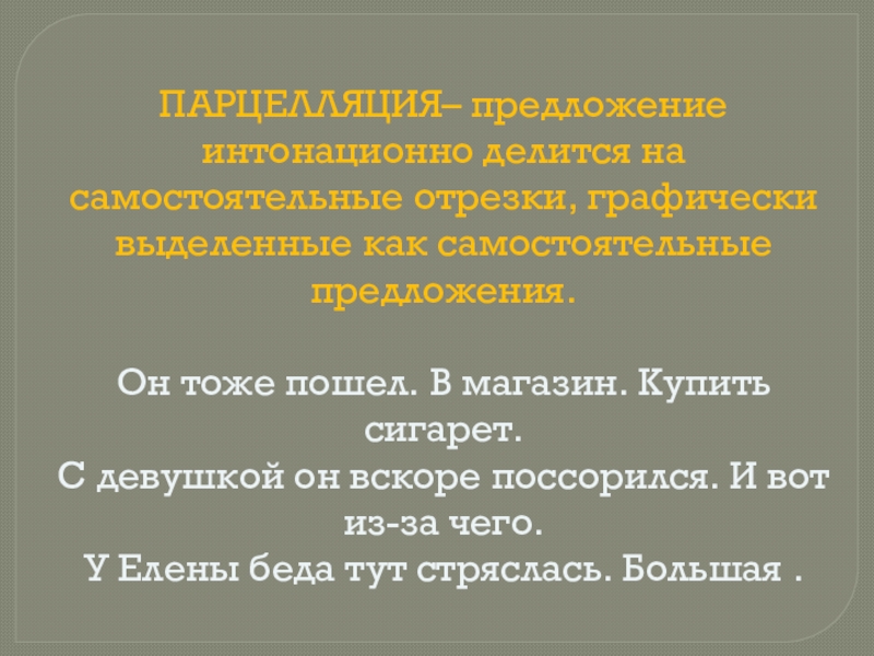 Слайд 13ПАРЦЕЛЛЯЦИЯ– предложение интонационно делится на самостоятельные отрезки, графически выделенные как самостоятельные
