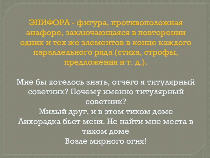 Слайд 5ЭПИФОРА - фигура, противоположная анафоре, заключающаяся в повторении одних и тех